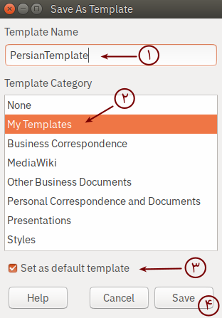 برای تنظیم الگوها به عنوان الگوی پیشفرض، نخست الگوی دلخواه خود را که از اینجا بارگرفتهاید باز کنید. سپس از منوی File و زیرمنوی Templates روی گزینهٔ Save as Template… کلیک کنید. در پنجرهای که باز میشود، نامی برای الگو بنویسید (مثلاً PersianTemplate)، دستهای برای الگوی خود از فهرست دستهها برگزینید (مثلاً My Templates)، روی گزینهٔ Set as default template را تیک بزنید، و در پایان الگو را ذخیره کنید.